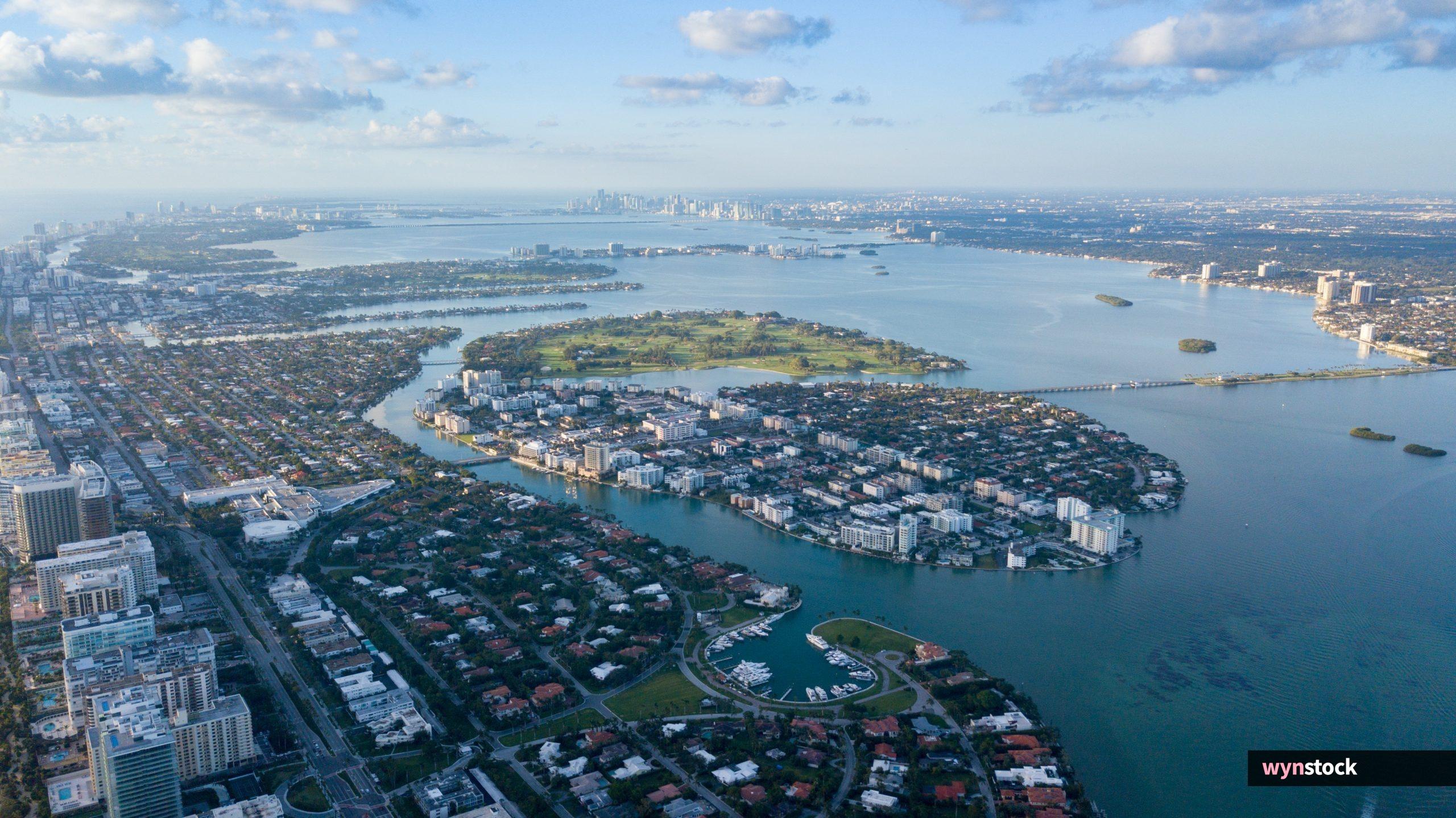 Aerial view of Miami Beach, Florida. Oceanfront condos, islands, and city skyline under a blue sky.