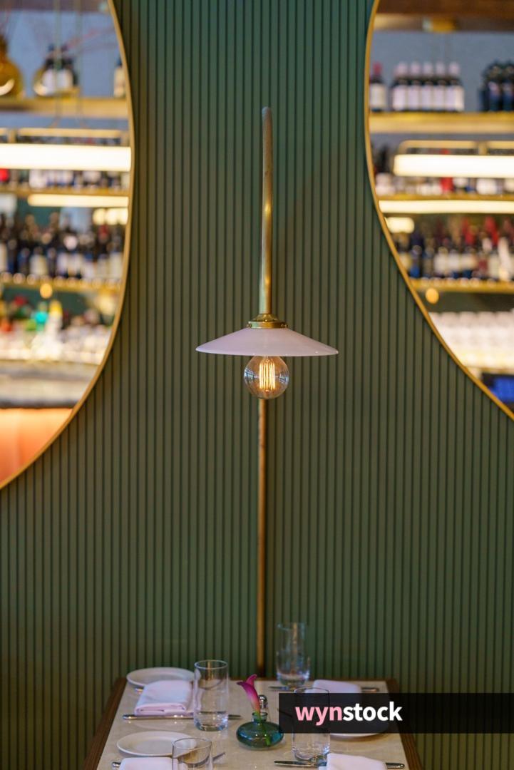 Restaurant interior with table setting, lamp, and mirrors reflecting a bar with wine bottles.